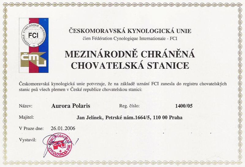 V průběhu času jsem zaregistroval chovnou stanici Aurora Polaris, zašli jsme na RTG kyčlí, který byl vyhodnocen jako 0/0, a začal shánět pejska vhodného ke krytí. Na radu Ilony Bártové jsem vybral Carromer´s Hurricane Joe což je importovaný pes z Anglie výborných exteriových a pracovních vlastností.